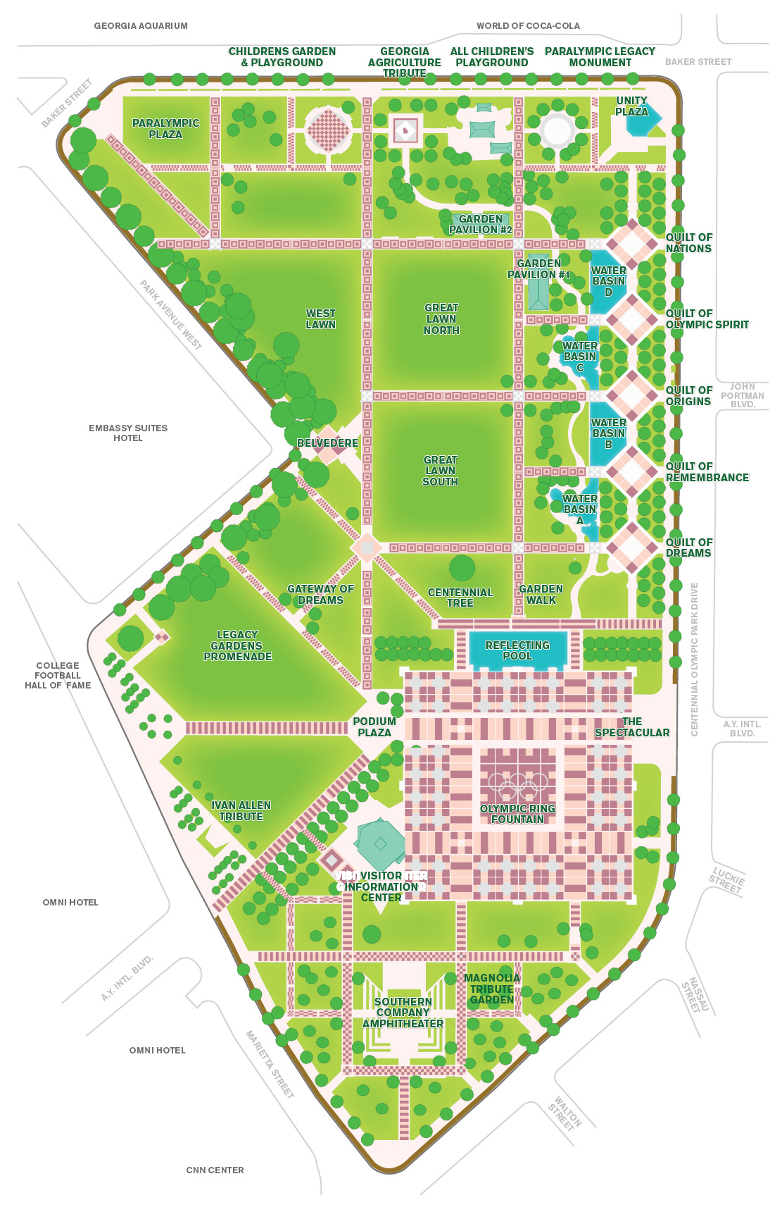 Organized team sports are not permitted within the Park. Riding bicycles, skating and skateboarding are prohibited on the fountain plaza and other brick areas, but are permitted on Andrew Young International Boulevard and perimeter sidewalks.